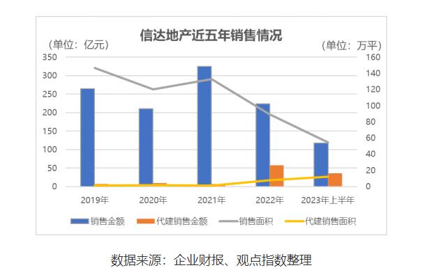 據了解,2021年,信達地產錄得銷售金額325.18億元,為上市以來的最高值;2022年受樓市下行影響,該公司銷售金額有所下滑,至224.18億元。不過,代建銷售金額提升至57.8億元。