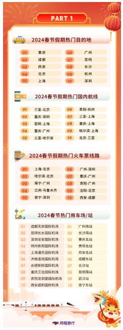 2024年春節(jié)假期,國內返鄉(xiāng)探親和休閑度假出游均增長顯著。同程旅行數(shù)據(jù)顯示,春節(jié)假期國內熱門城市的機票、火車票、酒店預訂同比漲幅均超過3成。重慶、成都、西安、北京、上海、廣州、昆明、長沙、杭州、深圳成為2024年春節(jié)假期國內熱門目的地。
