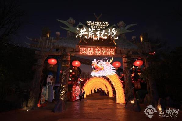 傍晚時分,天色漸暗,一盞盞形態各異的花燈悉數亮起。象征著幸福和繁榮的鯉魚形象的魚燈,有著“年年有余”“吉祥如意”等美好寓意。它們用彩綢、竹篾等材料制作而成,色彩鮮艷、栩栩如生。長達百米的巨龍盤踞在七彩云南歡樂世界中,龍身背后星星點點的紅燈籠相應呈現生肖龍與中國紅元素的巧妙融合。