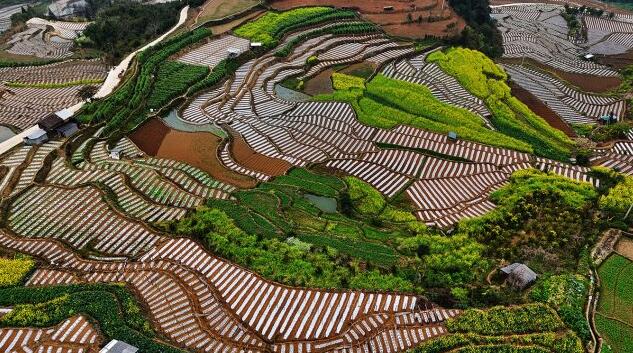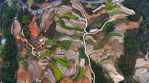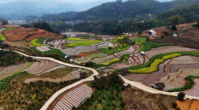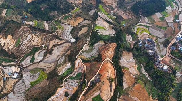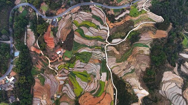 在農民勤勞的耕耘下,一層層梯田宛如一塊塊鑲嵌綠寶石的壁毯,在陽光的照耀下熠熠生輝。而一條條蜿蜒曲折的田埂,猶如一條條靚麗的銀鏈,穿插在一層一層疊加的梯田中,構成一幅層次分明的綠色畫卷。