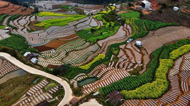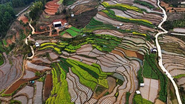 一座座青色或黃褐色的小田房點綴在層次分明的山水田園中,梯田如階梯般盤旋在山間水尾,與金黃的油菜花相映成趣,呈現出一幅原生態的美麗畫卷,讓人頓有“龍川江畔,梯田如畫”之感。