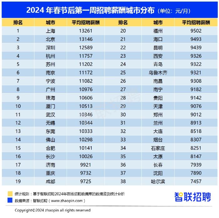 2024年春招季拉開帷幕。日前,智聯招聘發布《2024年春招市場行情周報》(以下簡稱《周報》)第一期;谌脚_招聘求職大數據,圍繞昆明等38個重點城市,解碼2024年春節后第一周招聘求職情況,呈現春招市場最新動態。