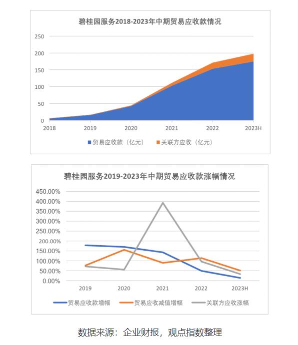 截至2023年6月30日,碧桂園服務(wù)貿(mào)易應(yīng)收款項較2022年底增加約24.36億元至183.92億元。其中,來自關(guān)聯(lián)方的貿(mào)易應(yīng)收款項約為23.01億元,較2022年末增加了約5.7億元,增幅32.9%;來自第三方的貿(mào)易應(yīng)收款項約為160.91億元,較2022年末增加了約18.7億元,增幅13.12%。