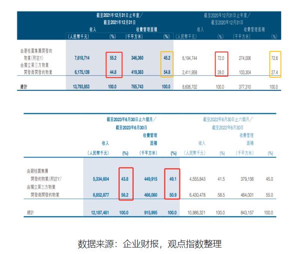 物業(yè)管理服務(wù)收入方面,2020年七成來自兄弟公司,2021年由于收購第三方的收費管理面積占比從2020年的27.4%上升至54.8%,來自第三方收入從28%增至44.8%,到2023年中期物管收入中來自第三方占比超五成。