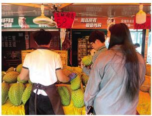 “榴蓮299元1件!”“你好,要帶個榴蓮嗎?”上周六下午2點,金馬正昌水果批發市場榴蓮批發區內,濃郁的香味撲鼻而來,金黃的榴蓮十分誘人。李先生經營的水果店,金枕榴蓮有兩個價位,分別為58/公斤、48元/公斤,干堯則賣38元/公斤。李先生介紹,春節后,金枕榴蓮價格有所下降,但與干堯相比,價格還是偏高!按汗澢埃鹫碣u到68—78元/公斤,現在降了20元,F在是金枕的淡季,數量少,進價太高了,要八九百元1件。我們現在不敢進貨,擔心漲價了沒人買。近期,越南的干堯陸續上市,價格也比金枕便宜,所以我們主推干堯。”
