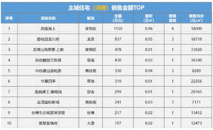 洋房市場無新增供應,近滇項目成為成交主力,高價去化帶動整體均價小幅上升。洋房銷售金額榜前三的項目分別為西南海上、碧桂園龍川府、龍湖山海原著·上宸!暗兔芷焚|樓盤”“觀滇現(xiàn)房”等賣點受到購房者青睞。