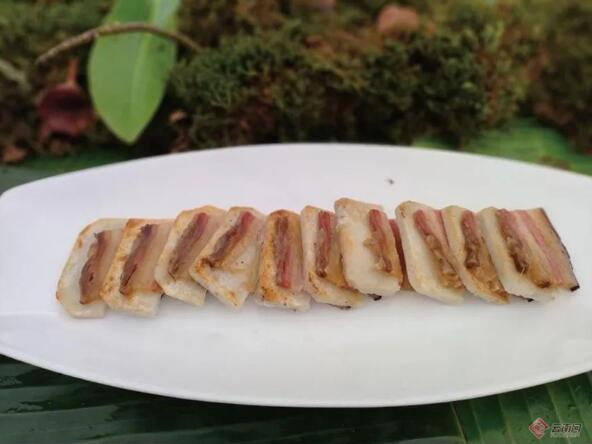“石漠梯田”由本地土豬肉精心腌制、后經(jīng)核桃樹、百香樹及雜木材小火慢慢熏烤數(shù)月,美味在時光和煙火氣息中慢慢發(fā)酵,直至臘肉色澤金黃。西疇自古以來一直流傳著“一家臘肉十里香,問君香味來何方,君子贊口董馬鄉(xiāng),誘得不食肉者想喝湯”的民間傳言。蒸煮切片后的臘肉,肥瘦相間形成整齊紋路,一般有三條以上紋路的油而不膩,口感最佳,當?shù)厝朔Q“三線肉”。石漠梯田名字的由來,和西疇人民勤勞實干,戰(zhàn)石漠、建“三保”臺地的“西疇精神”密不可分,一條條紋路像是一條條壘在石漠梯田上的石埂,石漠梯田用作菜品名稱,更體現(xiàn)著西疇人民的勤勞、智慧和熱情。
