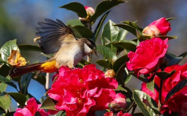 據茶花基地負責人介紹,騰沖茶花的花期長達半年,從每年的10月開始至次年4月底結束,這段時間基地都會免費對外開放。該基地每年都會吸引市民和各地游客前來,近兩年來,每年到茶花基地賞花的游客都超過了13萬人,今年春節以來,參觀人數已達11萬!坝捎诓杌凼区B類的美食,花開時節會有很多鳥兒前來嬉戲覓食,因此這里也成為了觀鳥攝影師拍攝的好去處,每年都吸引了大量攝影師不遠千里前來。”該負責人表示。