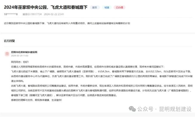 近日有網友通過地方領導留言板咨詢:巫家壩片區一些基礎設施沒有被列入市級重點項目,未來進展如何?對此,相關部門回復表示,片區市政基礎設施最為緊迫的是解決飛虎大道與春城路聯通問題,計劃先解決巫家壩南片區出行問題。