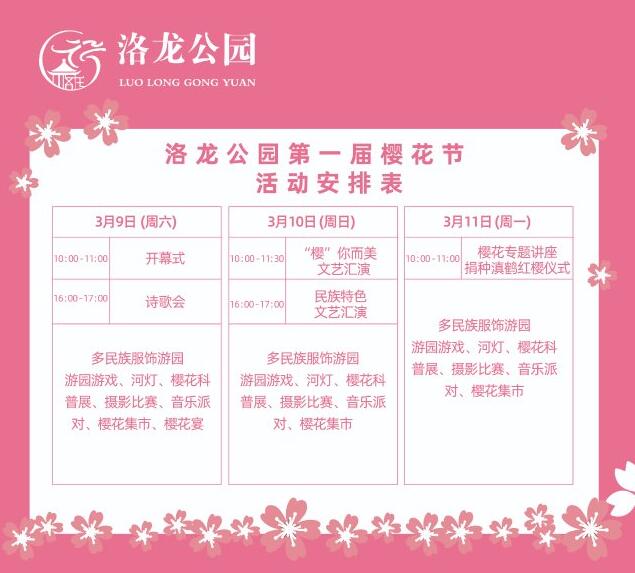 據(jù)悉,此次櫻花節(jié)活動(dòng)內(nèi)容豐富,有各民族特色文藝匯演、詩歌會(huì)以及多民族服飾游園、游園游戲、河燈、櫻花科普展、攝影比賽、音樂派對(duì)、櫻花集市等。