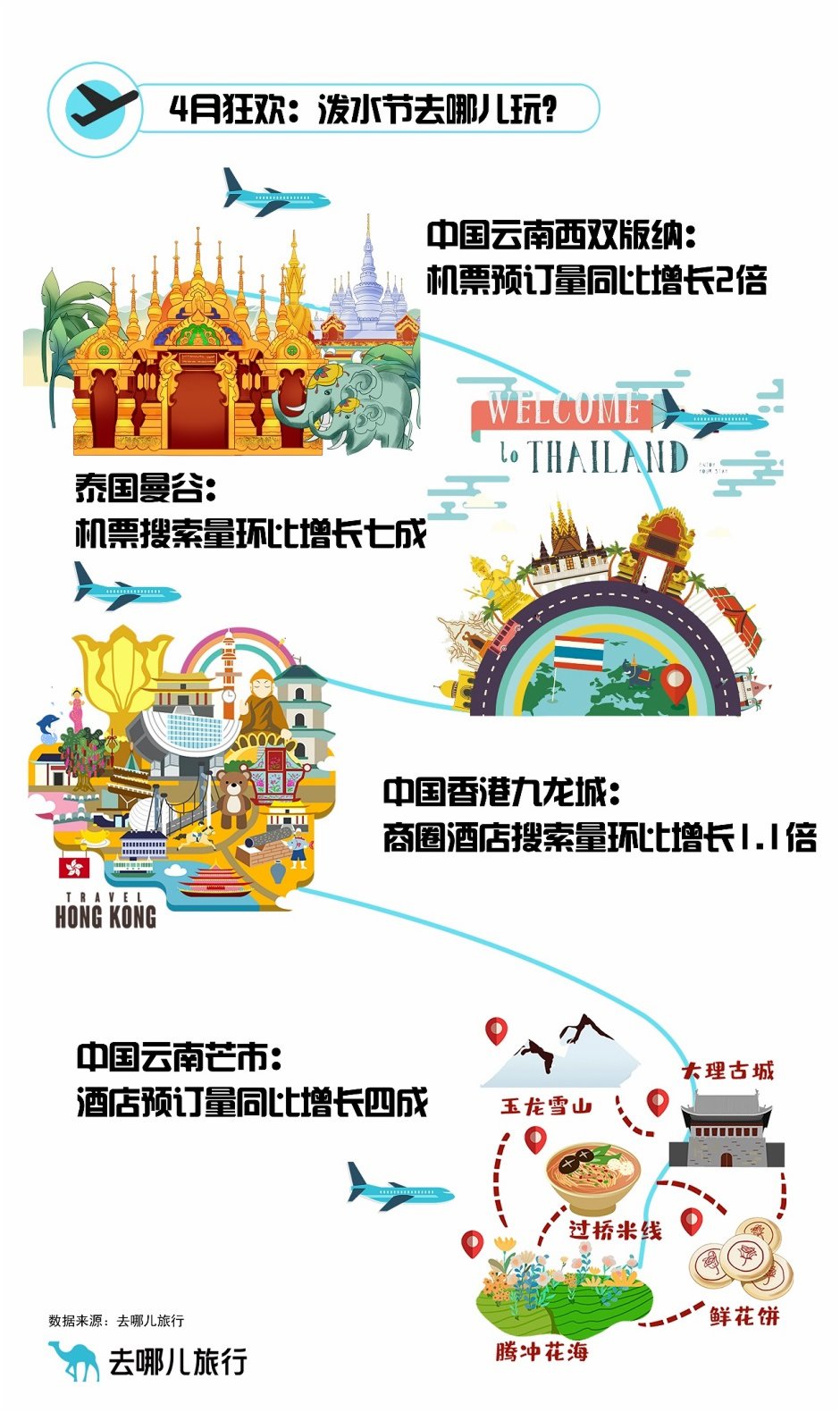 距離潑水節還有一個月時間,已有不少旅客提前預訂了飛往西雙版納的機票,截至3月5日,去哪兒數據顯示,預訂量同比增長2倍,省外客源地Top10為上海、重慶、杭州、長沙、廣州、北京、成都、南寧、南京、西安。預訂最早的旅客,提前100天購買了上海-西雙版納的機票。相較2023年3月,飛往西雙版納的航班更多,機票價格較2023年下降27%。價格方面,春城晚報-開屏新聞記者查詢獲悉,進入4月,上海直飛西雙版納裸票多在600~2000元之間;北京直飛西雙版納則在700~2000元之間。去哪兒大數據研究院研究員肖鵬表示:“好玩、有趣的節日正在成為旅游的風向標,特色活動帶動當地消費。”