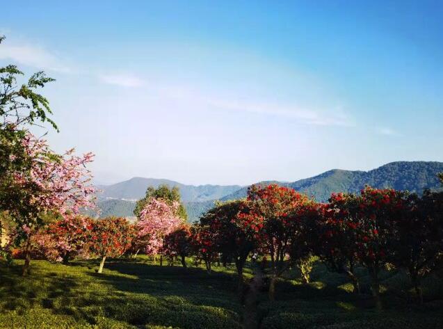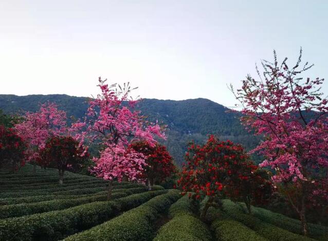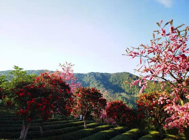 沿著蜿蜒的山路,在無量山覓到花開的足跡。漫山遍野中,火紅的馬纓花和春櫻爭相怒放,葉棚似綠云、花簇似紅霧,藍天白云下、枝枝綠云上,浮起團團“紅霧”,千紅遍地香,映照了滿谷茶園。一朵朵、一簇簇,花蕊在風中悠悠舞動,像一團團熊熊燃燒的火焰,紅艷似火、粉若云霞、花滿枝頭、飛紅點翠,簇擁在茂密的綠葉之間,異常絢麗。
