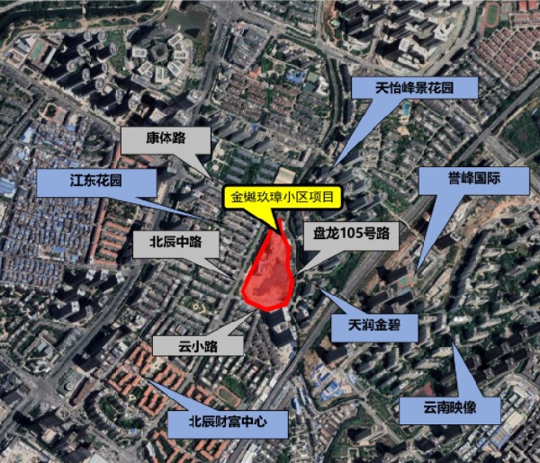 項目位于昆明市盤龍區(qū)金辰街道。凈用地面積28613.48平方米(約42.9畝),容積率4.49、建筑密度34.71%、綠地率25.09%。其地塊內(nèi)擬建設7棟高25-33層的住宅建筑和1所9班幼兒園,總建筑面積188248平方米。