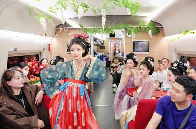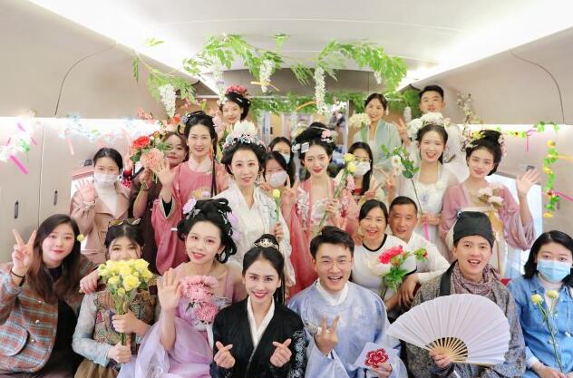 云南被稱為“世界鮮花王國”,為了讓旅客們更直觀地欣賞鮮花之美,感受濃厚的傳統文化氛圍,12名“金花”乘務員一大早便用鮮花將車廂布置一新,他們也裝扮成“十二花神”,以古風服裝、民樂演繹和傳統文化三大高熱度潮流為創意啟發,結合傳統文化體驗、非遺游戲、國風匯演等內容,讓旅客們耳目一新,體驗了一次不一樣的花朝節。