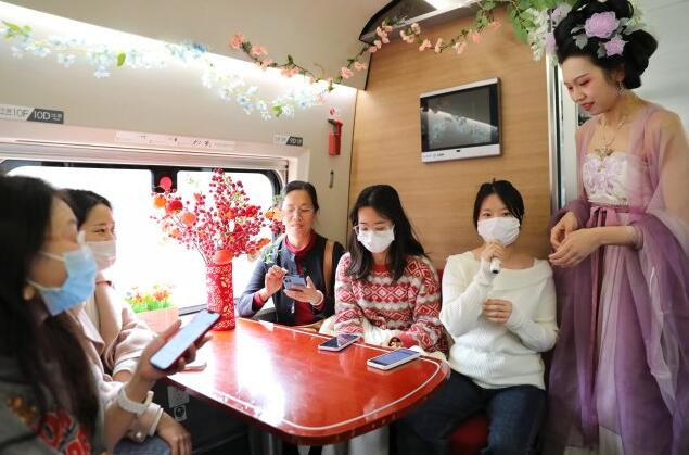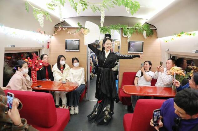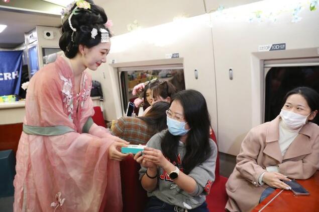 3月11日,在大理開往重慶西的G2850次高鐵列車上,中國鐵路昆明局集團有限公司昆明客運段“金花”乘務員策劃組織的“以花為媒,以節會友”花朝節活動,為乘車旅客獻上了一場賞心悅目的花朝春日宴。