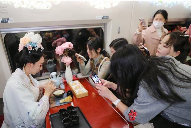 隨著列車長扮演的“石榴花神”在《染一卷書香》的音樂中翩翩起舞,列車花朝節活動拉開了序幕。曼妙的舞姿與動聽的旋律相得益彰,車廂內充滿了歡樂的氣氛。除了欣賞各“花神”帶來的精彩表演,旅客們還踴躍參與到各種非遺活動中。在“茶百戲”表演環節,“芙蓉花神”為旅客們帶來了精彩紛呈的視聽體驗,讓他們在品嘗香氣四溢的花茶同時,進一步感受到中國傳統文化的魅力。