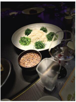 “刺身冰草”的做法遵循取食材本味的原則。食材選用來自山東青島的冰草,碧綠透亮,生機盎然。稍微做一下修剪,使得一棵棵冰草大小齊整,一一植入冰盤中,擺放均勻,這一道充滿春天氣息的涼菜就像一道藝術品,寓意“春季破土而出的嫩芽”。菜名帶“冰”,器皿有“冰”,吃到嘴巴里也透著絲絲涼氣,像極了乍暖還寒的春季氣候。