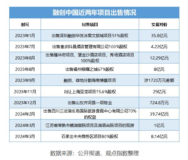 去年至今,融創中國接連出售了深圳冰雪文旅城項目51%、重慶文旅城的酒店資產、與首開股份合作的福州榕耀之城項目67%股權、與新湖中寶合作的上海亞龍項目15.6%股權等等。