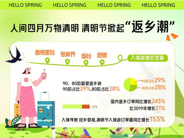 清明節也是返鄉祭掃、與親人團聚的節日,攜程數據觀測到,今年清明節國內返鄉的機票、火車票訂單同比去年上漲243%,相較2019年上漲21%。