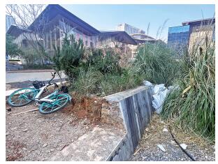 進(jìn)入營(yíng)銷中心前的場(chǎng)地,道路旁的雜草已經(jīng)高過膝蓋,角落里雜亂擺放著共享單車,堆積了不少生活垃圾。營(yíng)銷中心已經(jīng)關(guān)閉,透過玻璃能看到,室內(nèi)已落滿灰塵,沒有工作人員的身影。一旁電動(dòng)車保管站的張女士表示:“以前這里是個(gè)小夜市,晚上十分熱鬧,已經(jīng)荒廢了3個(gè)月左右,一直沒人管,這些地磚破損得非常嚴(yán)重,不安全,畢竟旁邊的商場(chǎng)(大悅城)人流量特別大。”