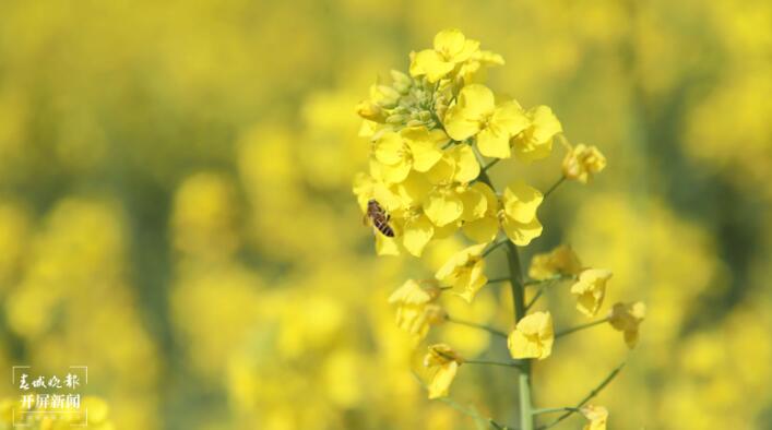 與其他地方的油菜花海稍有不同,夷都山的油菜集中連片種植,在春風吹拂下競相綻放。芳香馥郁的油菜花田像金色錦緞,美美地鋪排著在山野中,在春日暖陽下更加絢麗奪目,讓人心曠神怡。