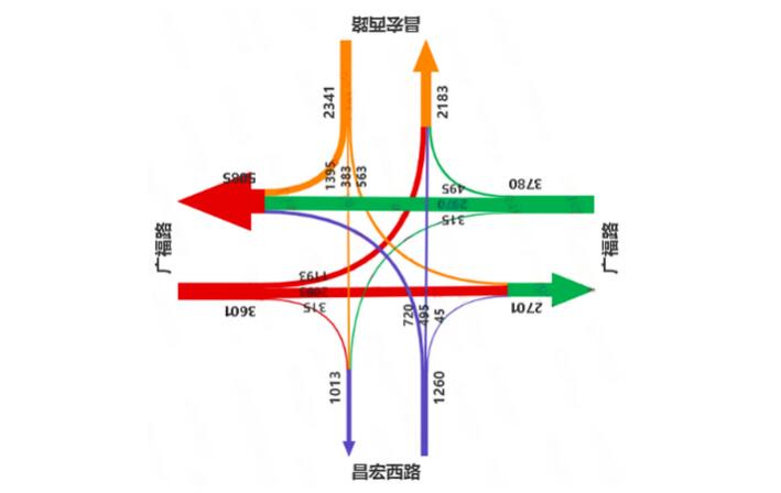 2.昌宏西路南向北方向高峰期間,直行車流通行需求明顯大于左轉車流通行需求,但左轉相位占用綠燈時長較長,直行車流放行時間較短,高峰期排隊長度達350米。