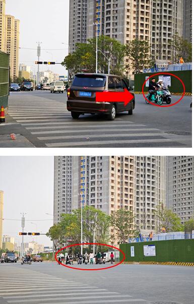 1.昌宏西路主道施工圍擋占用南口人行橫道線,左轉機動車視區受限,轉彎時與季宏路過街行人、非機動車沖突,存在較大安全隱患。