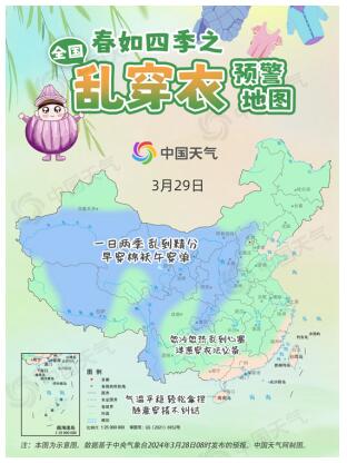 近日,我國多地氣溫開啟“隨機模式”,有的地方中午春意融融、早晚寒氣襲人,有的地方前一天氣溫飆升、后一天氣溫猛降,主打一個四季混搭。“亂穿衣”時節到了,大街上又出現了“短袖與羽絨服同框”的場景。中國天氣網推出“全國亂穿衣預警地圖”,為大家奉上實用穿衣指南。