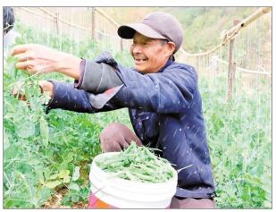 上午賣完前一天摘的豌豆,下午,農戶們馬不停蹄地前往自家的山地,開始新一輪采摘。山地層疊,豆苗碧綠,農戶們坐在一排排整齊的豆架前,用剪刀快速采摘飽滿的豆莢,不一會,就裝滿一籮筐。農戶葛玉仙邊采摘豌豆邊說:“今年種植了十多畝豌豆,預計能賣2萬塊錢。”