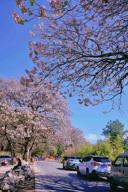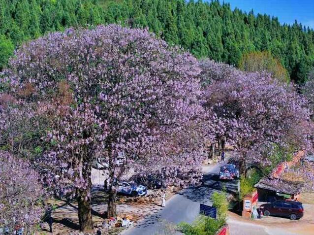 昆明黑筇公路郊野公園至團結鄉道路兩邊,已被淡淡的紫色點綴得熠熠生輝,這是屬于泡桐花的好時光。