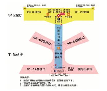 登機口數字為“301—342”的旅客,在T1航站樓完成值機和安檢后,需跟隨指示牌下坡,在詢問臺左轉,乘手扶梯下行左轉后乘前往S1衛星廳的電梯,到達B2層搭乘有軌電車“綠海豚”至S1衛星廳。