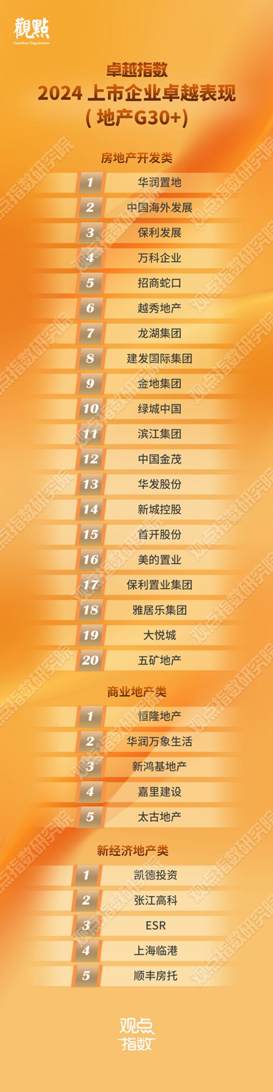 觀點(diǎn)指數(shù)結(jié)合地產(chǎn)及相關(guān)領(lǐng)域發(fā)展,于2024年繼續(xù)推出融合房地產(chǎn)開發(fā)、商業(yè)地產(chǎn)、新經(jīng)濟(jì)地產(chǎn)領(lǐng)域的地產(chǎn)G30+。最后,憑借著穩(wěn)健的經(jīng)營戰(zhàn)略,以及在行業(yè)下行期間所展現(xiàn)的抗風(fēng)險(xiǎn)與盈利能力,華潤置地獲得房地產(chǎn)開發(fā)組別上市企業(yè)卓越表現(xiàn)榜首,恒隆地產(chǎn)和凱德投資的卓越表現(xiàn)同樣值得肯定,分獲商業(yè)地產(chǎn)、新經(jīng)濟(jì)地產(chǎn)組別的首位。