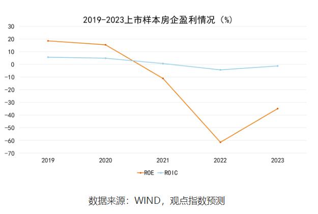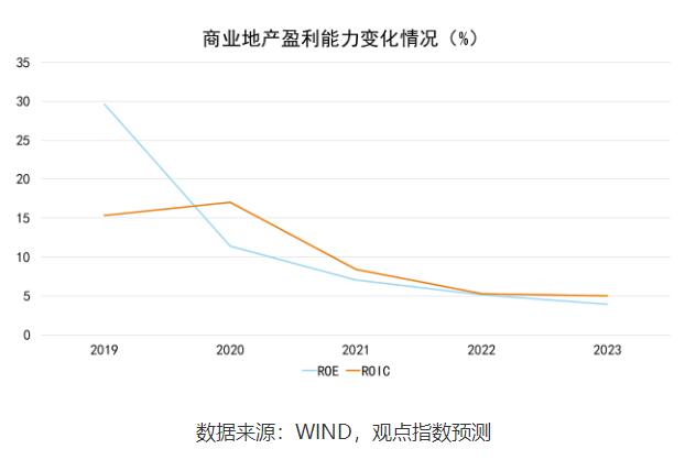據(jù)觀點(diǎn)指數(shù)對上市樣本企業(yè)統(tǒng)計(jì)及預(yù)測,在經(jīng)過2019-2022年的持續(xù)下降后,2023年商業(yè)地產(chǎn)企業(yè)的ROE和ROIC指標(biāo)基本穩(wěn)定,主要是企業(yè)投資物業(yè)收入同比有所上升,但物業(yè)銷售表現(xiàn)低迷,影響了企業(yè)的整體盈利表現(xiàn)。