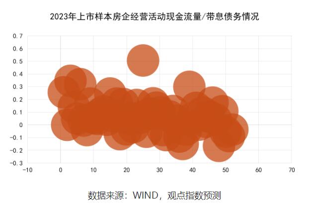 據(jù)觀點(diǎn)指數(shù)統(tǒng)計(jì)及預(yù)測,2023年樣本房企經(jīng)營活動(dòng)產(chǎn)生的現(xiàn)金流量/帶息負(fù)債主要集中在-0.1至0.2區(qū)間,當(dāng)前均值為0.073,遠(yuǎn)低于安全閾值。