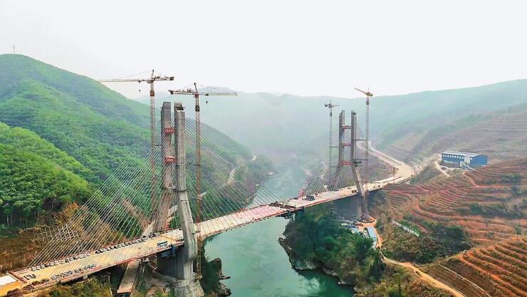 該項目由云南建投集團投資建設、云南省鐵路集團有限公司負責施工。在橋梁承臺、主塔、主梁、掛索施工過程中,項目研發了大體積承臺混凝土施工技術,索塔異形橫梁懸臂端少支架現澆法,受限空間條件下斜拉橋超寬長平臺前支點牽索掛籃設計與支架法安裝技術,多變、異形、大斜率斜拉橋索塔勁性骨架設計與施工技術,索塔橫梁異步施工工況下寬幅PC斜拉橋塔梁同步施工等技術,實現了多項技術突破。