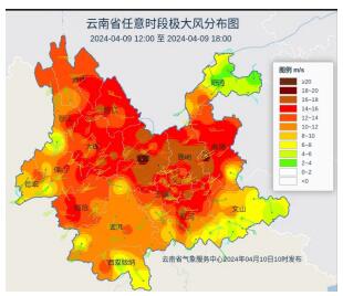 午后至夜間怒江州、迪慶州、麗江市、大理州、保山市南部、臨滄市、普洱市北部、楚雄州、玉溪市、昆明市、紅河州北部、文山州西北部、曲靖市西部、昭通市南部局地出現7—9級(13.9—24.4米/秒)陣風。