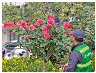 綠化服務(wù)人員對月季進(jìn)行日常管養(yǎng) ■ 都市時報全媒體記者 李瑞瑩