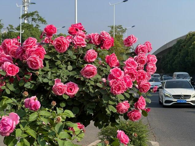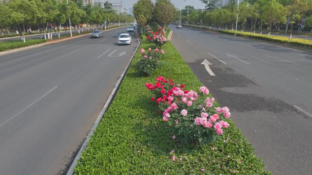4月的昆明,月季是綠化帶的“主角”。在官渡區廣福路、彩云北路、云秀路、國貿路等道路上,月季迎來了盛花期。一團團、一簇簇,紅色艷麗,粉色溫馨,白色純潔,美不勝收。行走在街頭亦或是開車路過,一種香氣四溢的浪漫一路襲來,繁花似錦、春意盎然的景象讓人忍不住要拍照留念。