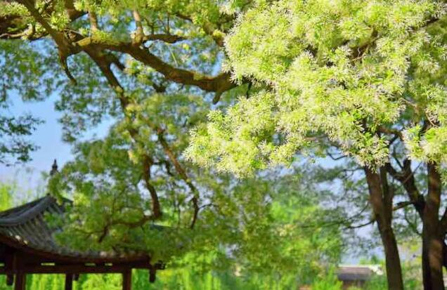 流蘇花在白族語(yǔ)中稱“古魯花”。每年4月份,流蘇樹(shù)開(kāi)出白色的花,近看,條狀的花組合在一起,花團(tuán)錦簇,猶如白雪。遠(yuǎn)看,滿樹(shù)的白花如同朵朵白云飄浮,整個(gè)古村被籠罩在一片朦朧的云海之中。