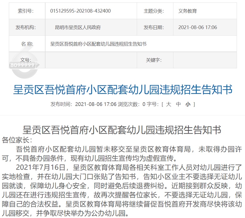 2021年,吾悅首府新建成的幼兒園開始招生,不料還沒正式開學,8月份呈貢區教體局發布違規招生公告,稱吾悅首府小區配套幼兒園暫未移交至呈貢區教育體育局,未取得辦園許可,不具備辦園條件,現有幼兒園招生宣傳均為虛假宣傳,并提醒市民不要選擇該無證幼兒園。