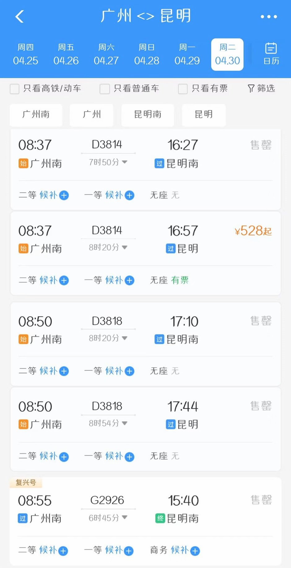 省外方向,上海、北京、廣州、成都、重慶至昆明,均有車次售罄。