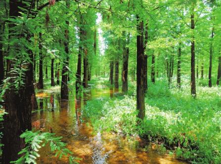 生態向好,市民和游客共享美好生活。濕地里種植有3.2萬株中山杉,中山杉根系發達,可凈化水質減輕入湖負荷。為保護濕地生態環境而種植的萬畝中山杉,意外構成了一幅色彩明亮的水墨畫,塑造了杉樹林立、林下有水、水中有魚、水流循環的獨特濕地景觀。
