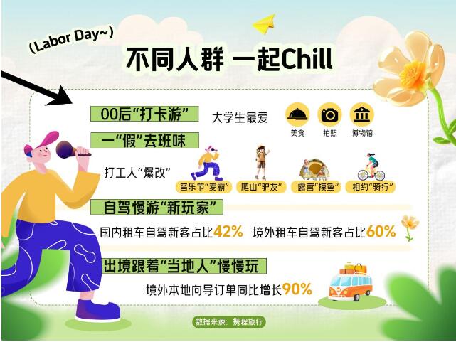 從攜程預(yù)訂數(shù)據(jù)看,五一假期,00后群體熱衷的旅游目的地依次重慶、上海、武漢、北京、南京、天津、西安、長沙、成都、青島。與室友、旅游搭子結(jié)伴出游,到當(dāng)?shù)仄穱L美食、打卡拍照、逛博物館成為大學(xué)生喜歡的旅游方式!拔逡弧鼻跋Γ瑪y程先后聯(lián)合煙臺、東營、鞍山等地文旅局,開展校園推廣,推出火車票補(bǔ)貼、設(shè)置打卡點等活動,吸引大學(xué)生到目的地游玩。