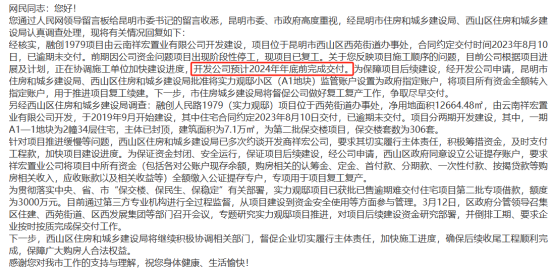 人民路1979又要延期交房了。近日,有網友在人民網地方領導留言板上反映人民路1979項目有再次爛尾的風險,昆明市住房和城鄉建設局、西山區住房和城鄉建設局答復稱前期因公司資金問題項目出現階段性停工,現項目已復工,開發公司預計2024年年底前完成交付。