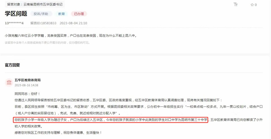 五華區(qū)教體局在這份留言的回復(fù)中提到了很多關(guān)鍵信息,包括“一年級入學(xué)為隨遷子女”,“戶口為后續(xù)遷入”等。