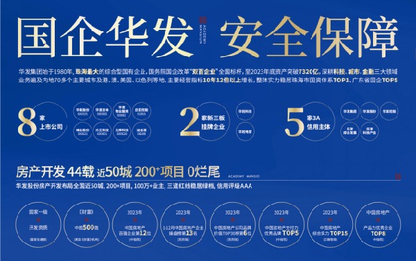 華發集團是珠海最大的綜合型國有企業,國企國務院改革“雙百企業”全國標桿,截止2023年底,總資產額超7320億。華發股份作為華發集團房產板塊上市公司,房產開發44載,全國近50城200余個項目0爛尾。華發為昆明兌現一座百萬方全能生活城,不僅讓業主們感受到了國企華發的責任和用心,更讓市場感受到了國企銷冠紅盤的超高品質兌現力。來源于背后國企品牌實力的保障。