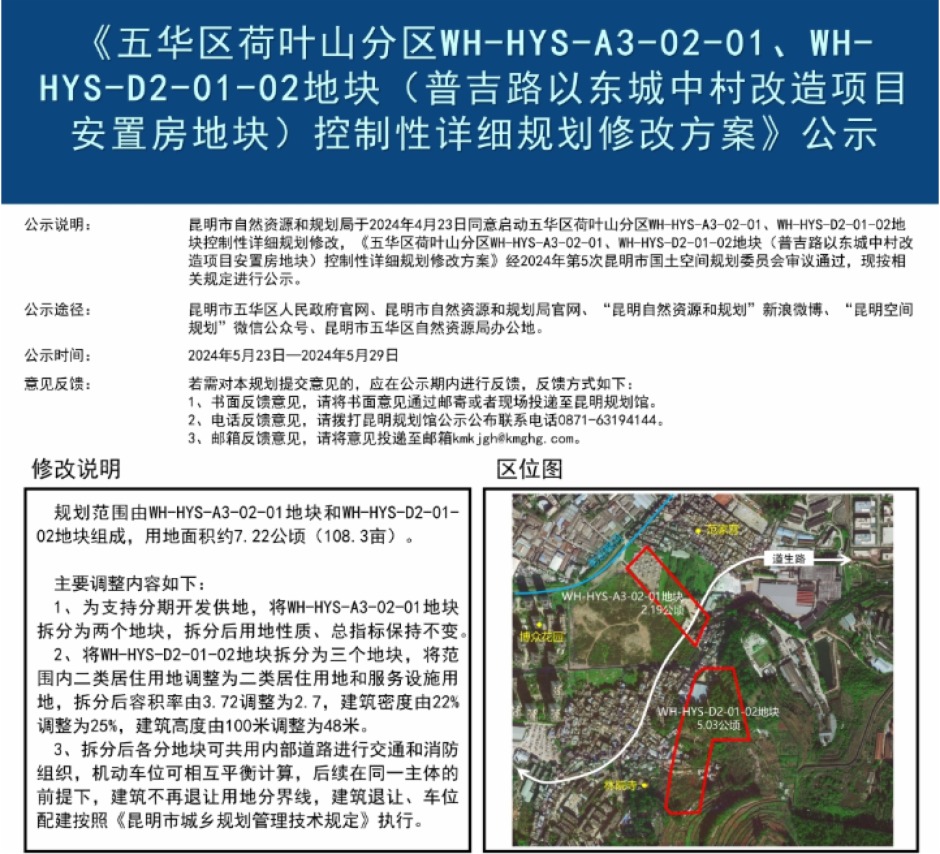 5月23日,《五華區荷葉山分區WH-HYS-A3-02-01、WH-HYS-D2-01-02地塊(普吉路以東城中村改造項目安置房地塊)控制性詳細規劃修改方案》公示。