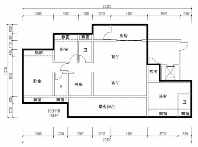 143平米四房?jī)尚l(wèi)戶型的陽(yáng)臺(tái),僅標(biāo)注了長(zhǎng)度為6米,寬度大致估算應(yīng)不少于3米,面積接近20平米,飄窗和獨(dú)立電梯廳也和169平米戶型差不多。