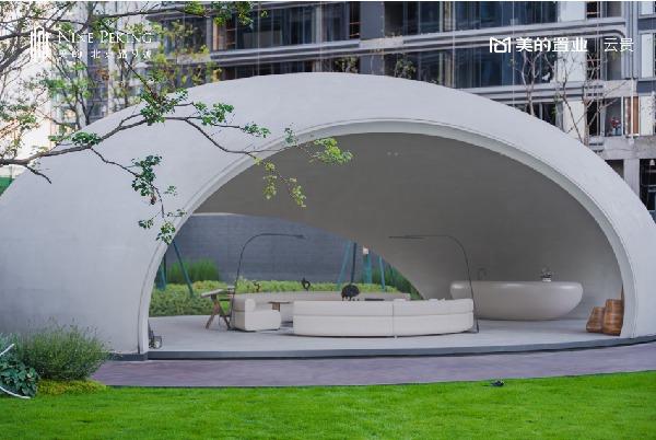 本次開放的是小區(qū)中心園林,中庭異型結(jié)構(gòu)靈感是以示范區(qū)為母體,如同脈絡(luò)般向大區(qū)滲透并煥發(fā)生長出新的自然生命體,為交付區(qū)注入了新的活力,形成與自然共生的現(xiàn)代美學(xué)。