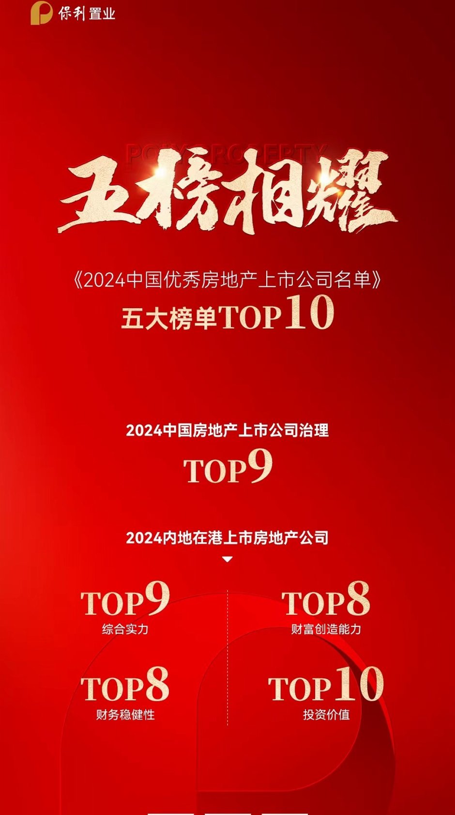 保利置業榮獲 “2024內地在港上市房地產公司綜合實力”“2024內地在港上市房地產公司財富創造能力”“2024內地在港上市房地產公司財務穩健性”“2024內地在港上市房地產公司投資價值”“2024中國房地產上市公司治理”五大榜單TOP10。